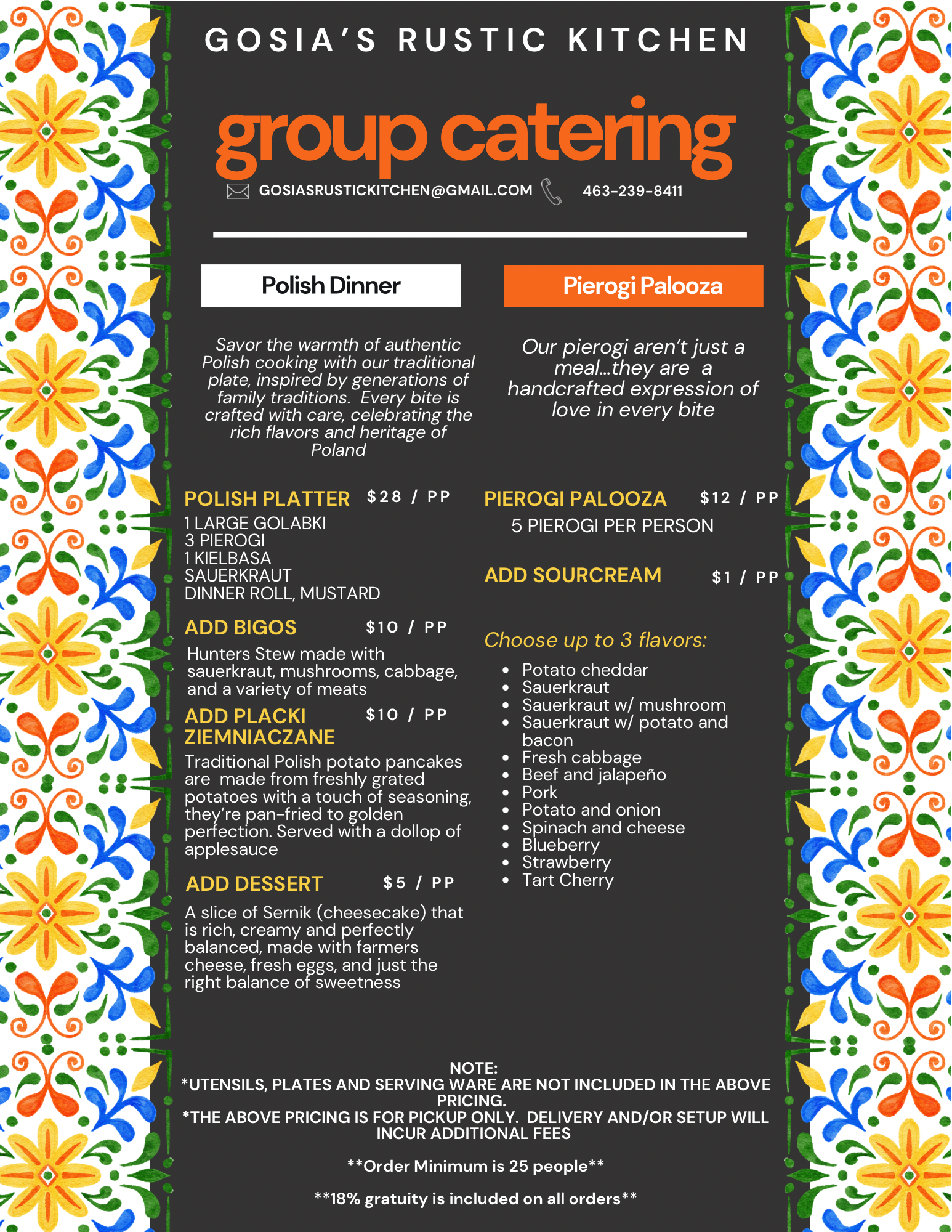 At Gosia's Rustic Kitchen, we understand that your wedding day is one of the most important days of your life, and our wedding catering services are designed to make it unforgettable. We offer custom menus that reflect your personal tastes, ensuring that each dish is crafted to perfection. Whether you envision a multi-course plated dinner, an elegant buffet, or unique food stations, our experienced chefs work closely with you to create a menu that complements your theme and wows your guests. Our team also handles everything from setup to cleanup, allowing you to focus on enjoying your special day.